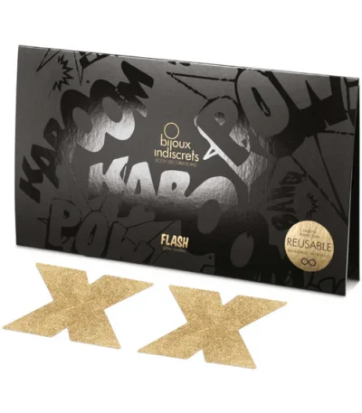 Product description Elevate your look with the Flash Glitter Cross Pasties by Bijoux Indiscrets. These eye-catching gold glitter nipple pasties