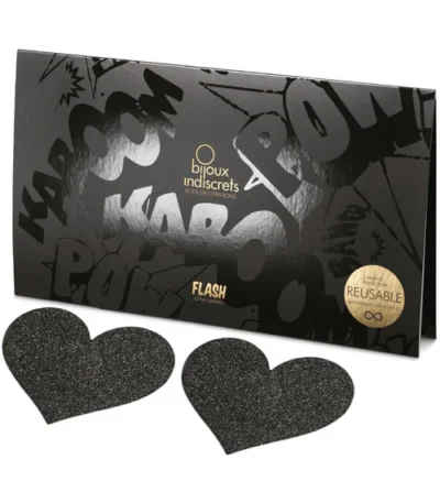 Product description Turn up the glamour with the Flash Glitter Heart Pasties in black by Bijoux Indiscrets. These eye-catching gold