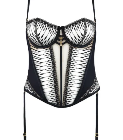 Product description Elegant and seductive basque Underwired for support Embroidered tulle with gold lurex Bronze jewel detailing Shoulder straps are