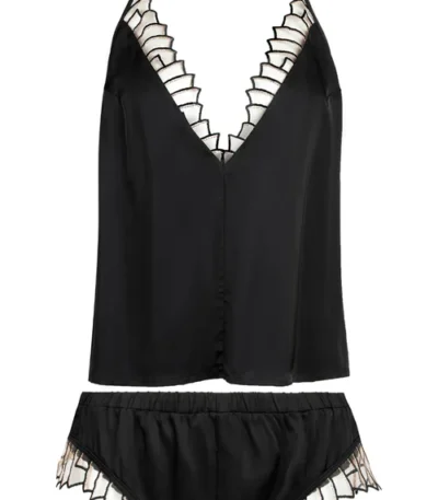 Product description Chic and comfy two-piece set crafted from soft, satin viscose and graphic and transparent embroidery. Top: • Plunging