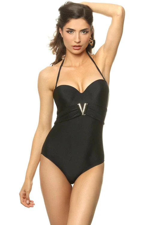 Chic and sexy, discover the Anakena Swimsuit from Jolidon. Crafted from soft black material this luxurious one-piece features a flattering sweetheart neckline, a decorative ‘V’ jewel at the front.