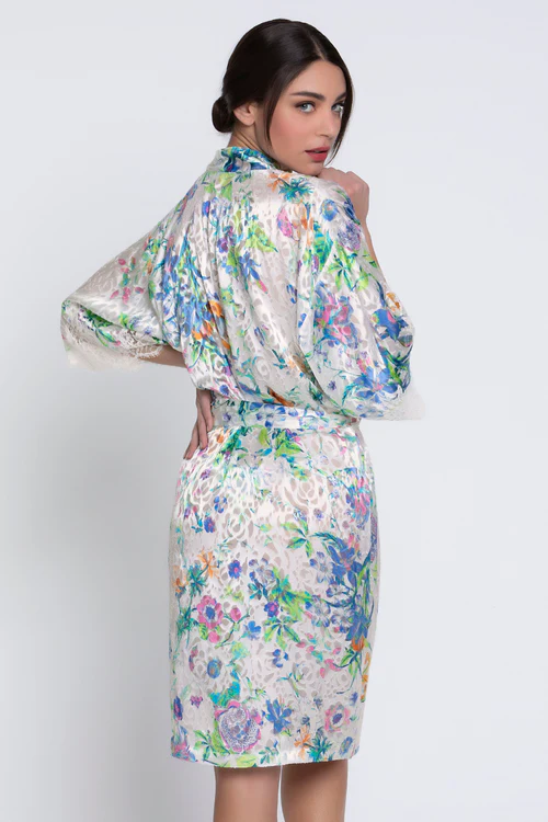 Indulge in elegance with the Baisers Legers Mid-Length Robe from Lise Charmel. Crafted from luxurious printed Devoré fabric, this robe ties at the waist for a perfect fit. The lace inlay on the bottom of the sleeves adds a touch of sophistication to this must-have garment. Elevate your loungewear with this exquisite piece.