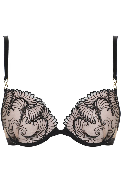 Enhance your silhouette with the Basic Instinct Push-Up Bra from Jolidon. The sheer mesh and decorative tattoo embroidery add a touch of sensuality, while the microfiber and elastic trims provide comfort. The mousse sponge cup and underwire give you the perfect lift and support. A must-have for any lingerie collection.