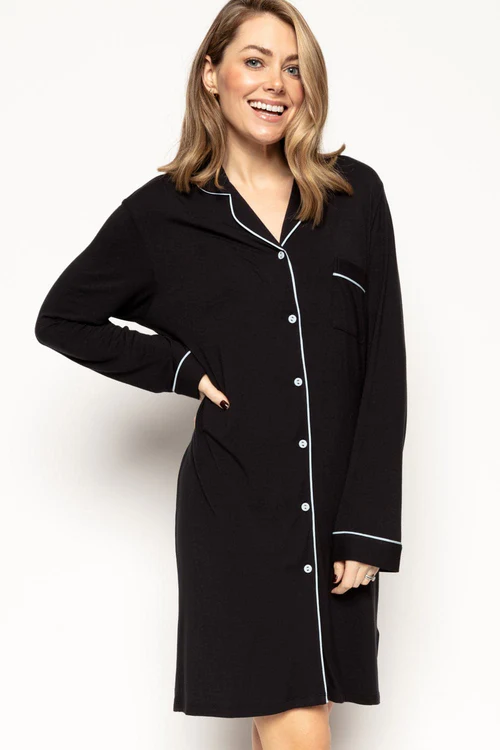Superb comfort and elegance combine in the Beth revere collar, long sleeve jersey nightshirt. Made from beautifully soft modal and elastane, the nightshirt is trimmed with a light blue modal for a timeless and exquisite finish. The nightshirt has a revere collar, single pocket and fastens at the front with light blue, modal covered buttons. The perfect piece to lounge or sleep in cosy, comfort.