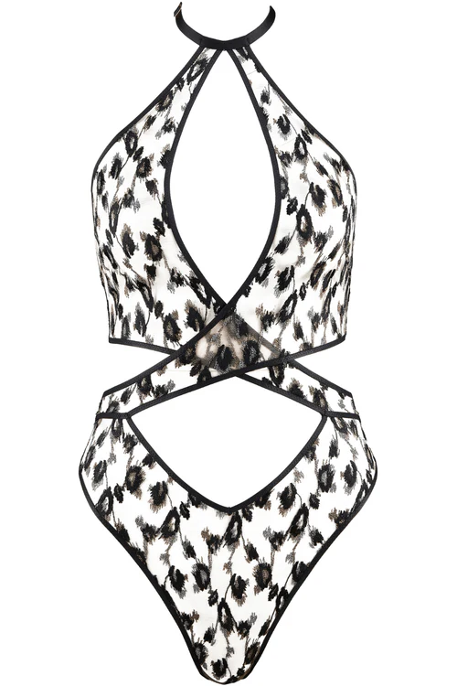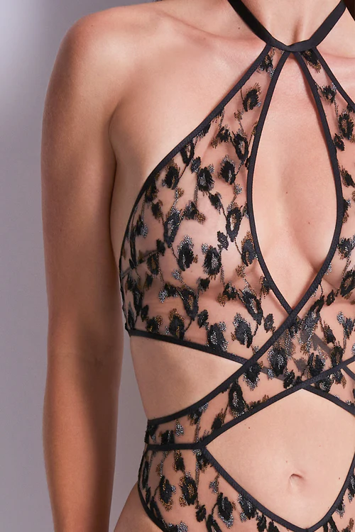 Dare to create a wild allure with Absolutely Wild. With animal-inspired embroidery with metallic reflections, the bodysuit is highlighted with bondage-style straps and pretty golden rings.