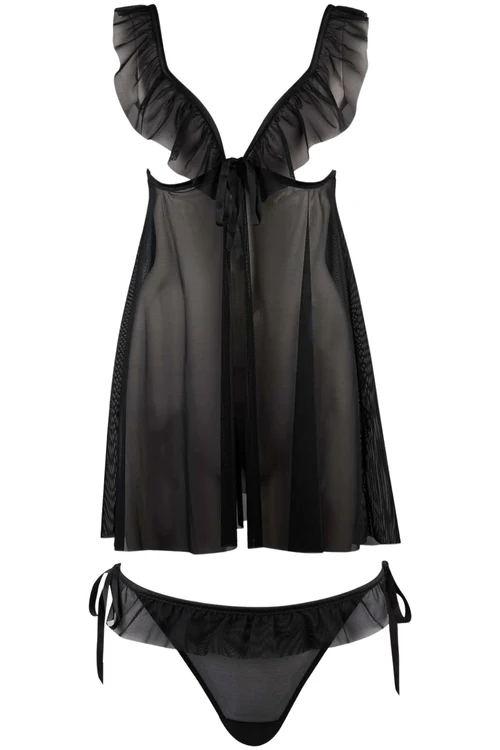 The Boîte à Désir Untie Me Babydoll & Thong set from Aubade is an irresistible two-piece lingerie ensemble. Crafted from sheer black tulle, the babydoll features open cups, adjustable shoulder straps, and a front tie for a seductive look. The flirty thong features adjustable side ties for your perfect fit. Make a bold statement in this luxurious two-piece black lingerie set. The babydoll set is designed by Aubade Paris, ensuring quality and a touch of sensuality in each piece. Discover more sexy styles in our Luxury Lingerie and Aubade Boîte à Désir collections.