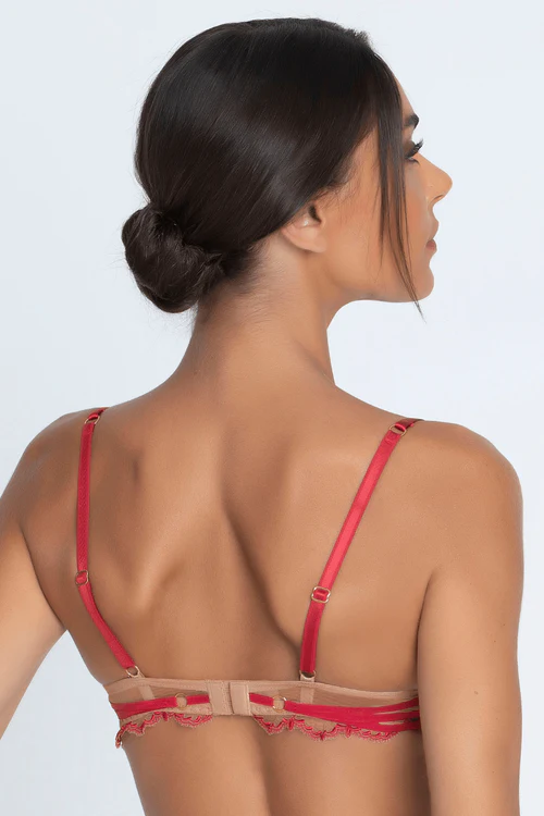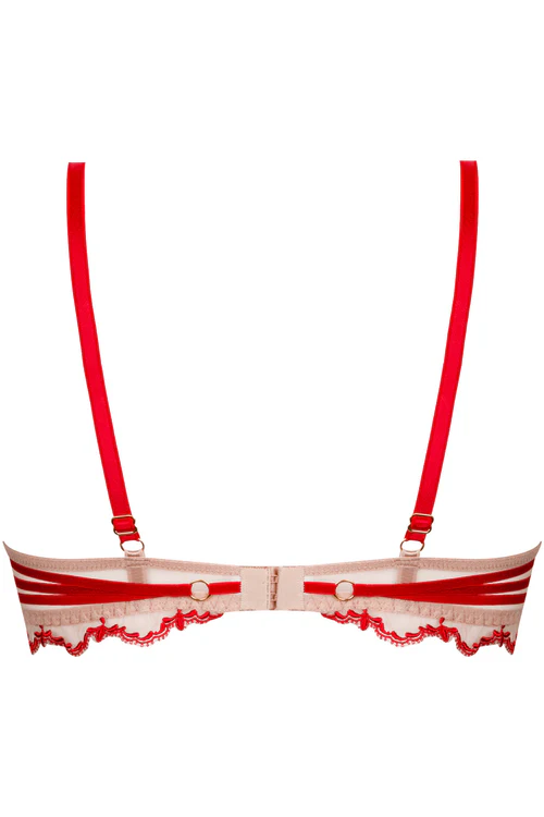 The Lise Charmel Eblouissant Eros Demi Bra is crafted from red embroidery on beige tulle. It has soft, underwired cups and adjustable shoulder straps for a perfect fit. Elastic straps decorative the wings, and a red jewel between the cups adds an extra luxe touch.