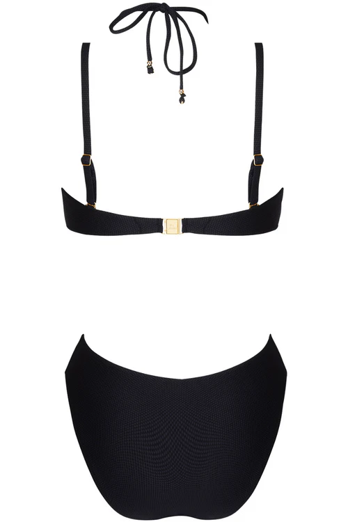 • One-piece swimsuit in black and gold.