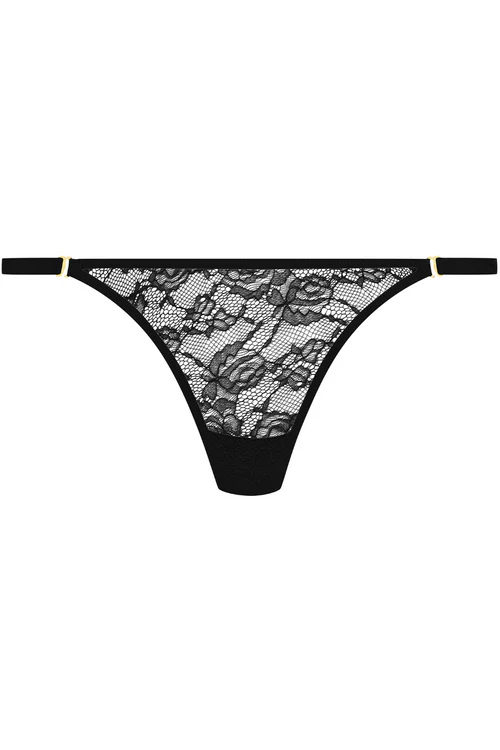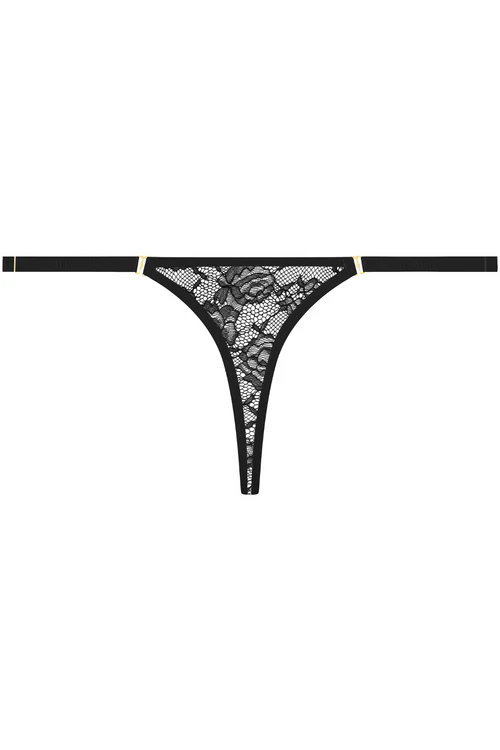 The Flashback Mini Thong in black by Maison Close combines bold allure with luxury design. Crafted from elegant, semi-sheer floral lace, this thong exudes sophistication with minimal coverage. The adjustable, interchangeable elastic straps ensure a customized fit, while flat elastic edging creates a smooth, flattering silhouette. This sexy thong is ideal for special moments or as an everyday staple.