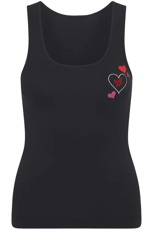 Sleep time just got sweeter in Lovie. Soft black jersey has been adorned with love-heart embroidery, making this the perfect cute set for cosy evenings and lazy lounging mornings. Team with the matching Lovie briefs for a cute loungewear look.