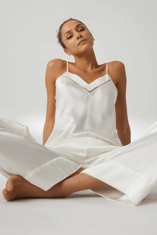 Timeless and glamorous, discover the Nocturne camisole Simone Pérèle. Crafted from beautiful silk satin, it features a V neckline with tulle detail and is trimmed with floral around the hem. The Nocturne Cami is too beautiful to hide, so why not wear yours as outerwear with a jacket or as luxurious nightwear set with the matching Dream shorts and pants?