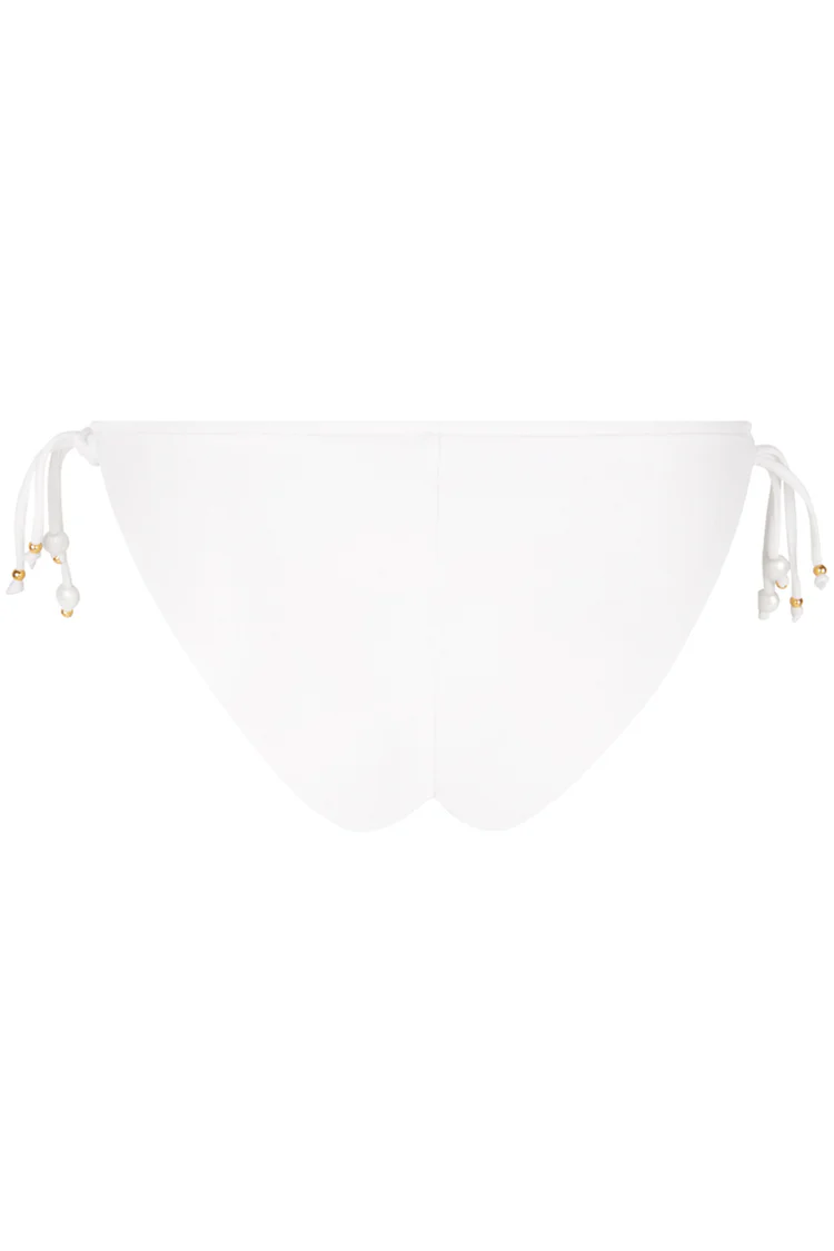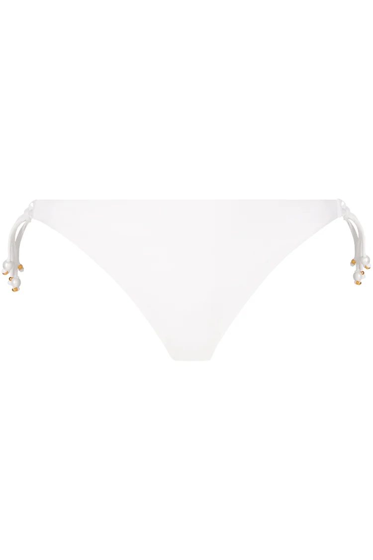 Sexy and elegant, the Perles Nacrées Bikini Brief is made from soft white knit in a low-waisted silhouette that’s perfect for summer, either on the beach or at the pool. There are openings on the sides of the hips with daring lacing embellished with mother-of-pearl and gold beads.