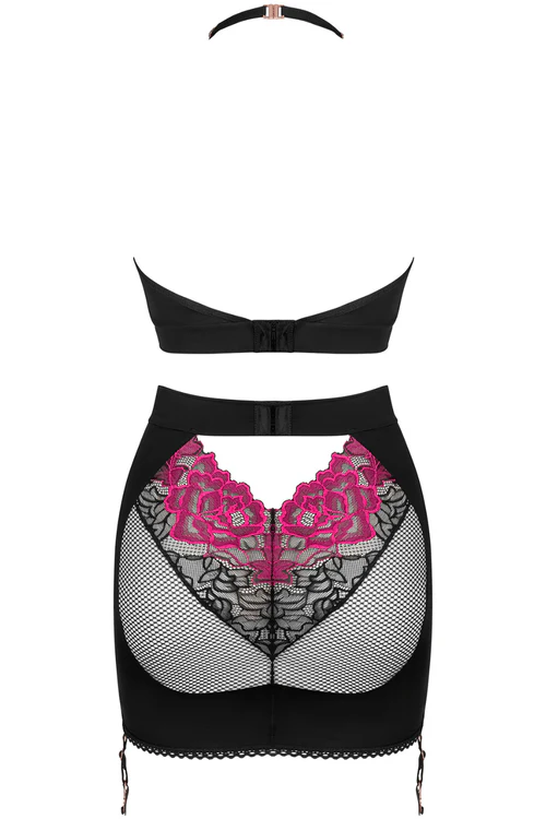 If you are drawn to unique lingerie, like a moth to a flame, then this set is just for you. The transparent mesh coquettishly accentuates the curves of the bust and buttocks, and the floral pattern will spice up the sensual black with a touch of colour. Uncover a totally different world where sensual inventiveness reigns!