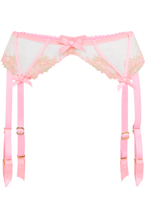 Tessy lays sparkling gold embroidery upon whisper-light tulle, framed with neon pink details for playful, made-you-look glamour.