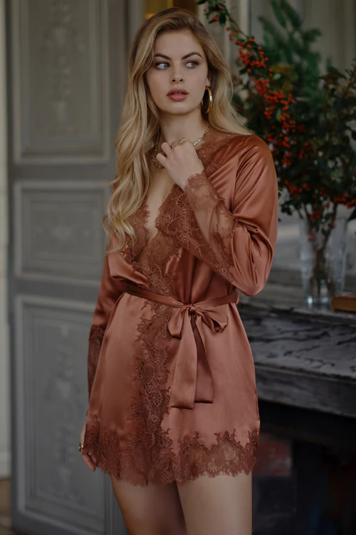 The Marjolaine Valerie Short Silk Kimono with Lace in brown is the season’s most romantic dressing gown. Crafted from luxurious silk, it features intricate lace detailing along the neckline, cuffs, and hem, exuding timeless sensuality. This short-length kimono is elegant and alluring, with a removable silk satin belt and side loops for a perfect fit. It is a stunning choice for anyone looking to captivate and charm.